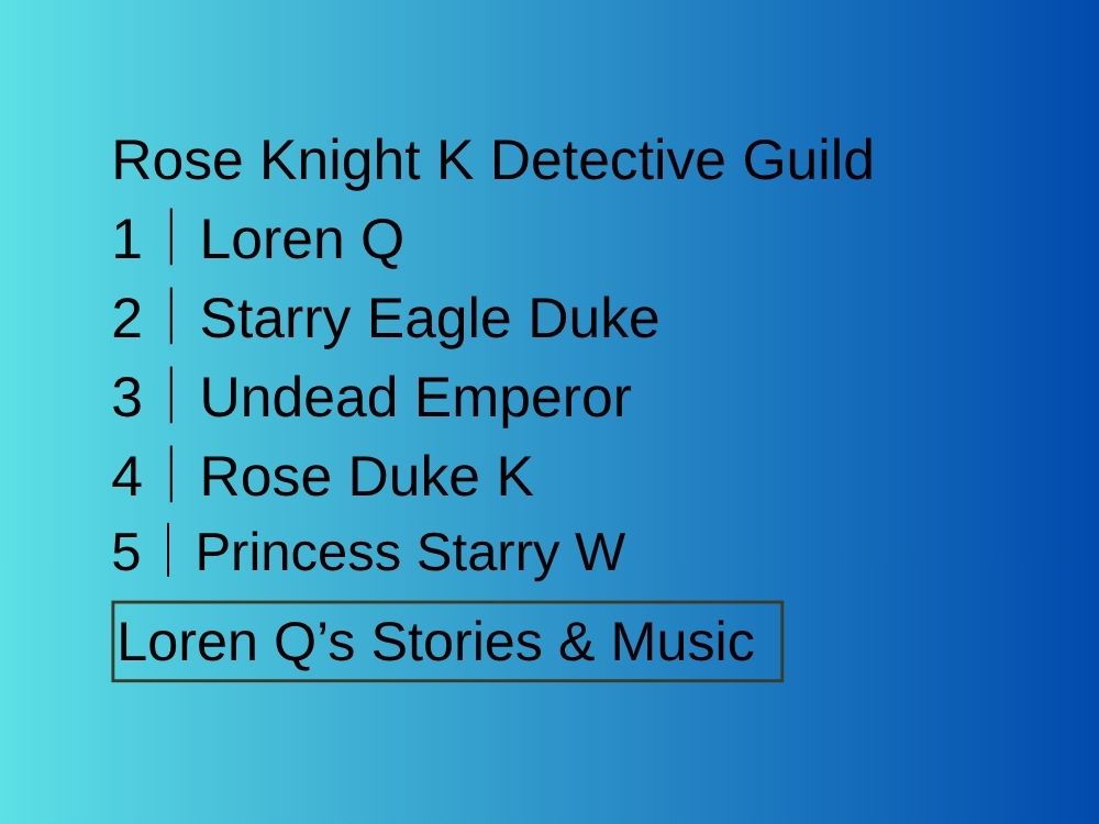 Rose Knight K Detective Guild – Member Profiles|Loren Q|Starry Eagle Duke|Undead Emperor|Rose Duke K|Princess Starry W, wife of the Rose Duke|Loren Q’s World of Stories & Music